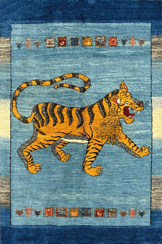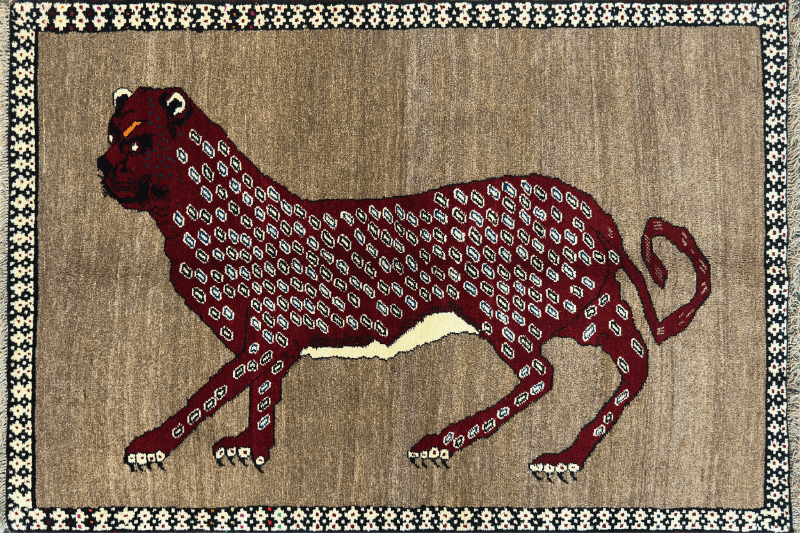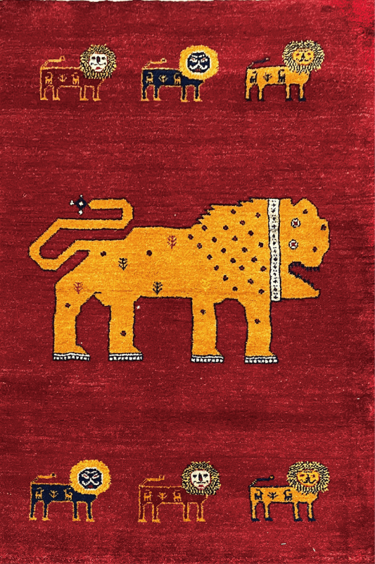 ライオンの姿はいつしかその強さのみが切り取られ、中には虎や豹をモチーフに使⽤したライオンギャッベも数多く⾒られます。