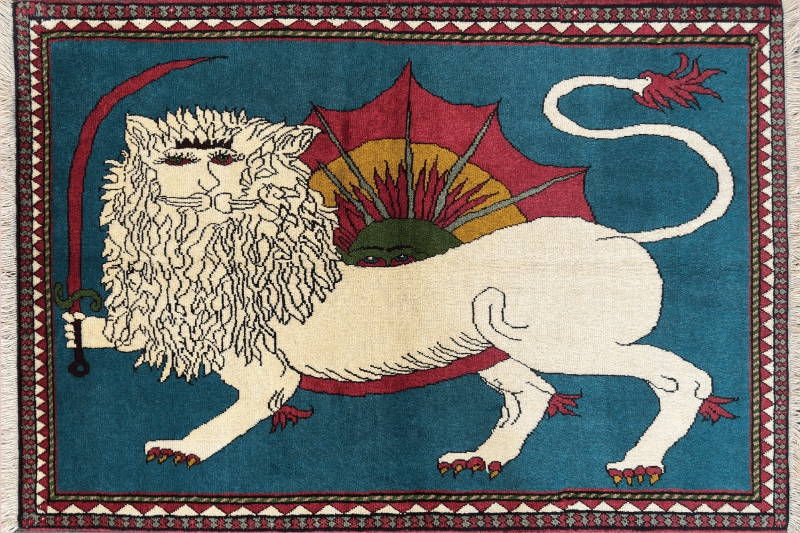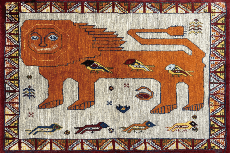 古来より権威の象徴としてシンボル化していたライオンを絨毯に織り込み、それがプリミティブアートとして欧⽶で⼈気が出たことから有名になりました。絨毯の意匠に昇華されていくなかでデフォルメされたライオンの姿はどこか愛らしく、思わず笑みがこぼれてしまいます。